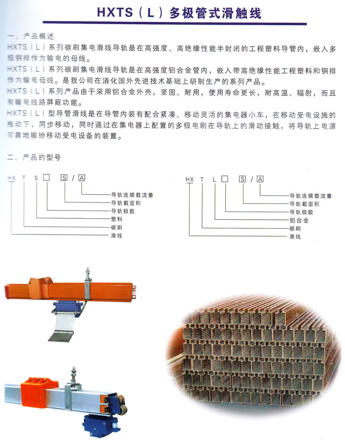 HXTS、HXTL系列多極管式滑觸線由高強度工程塑料絕緣導管或鋁合金保護殼、多級導電銅排、集電器以及懸吊、固定等組件組合而成。該產品以其設計緊湊、性能穩(wěn)定、使用安全的特點被廣泛地應用于電流較小、使用頻率較高的物流自動化流水生產線以及檢測線。