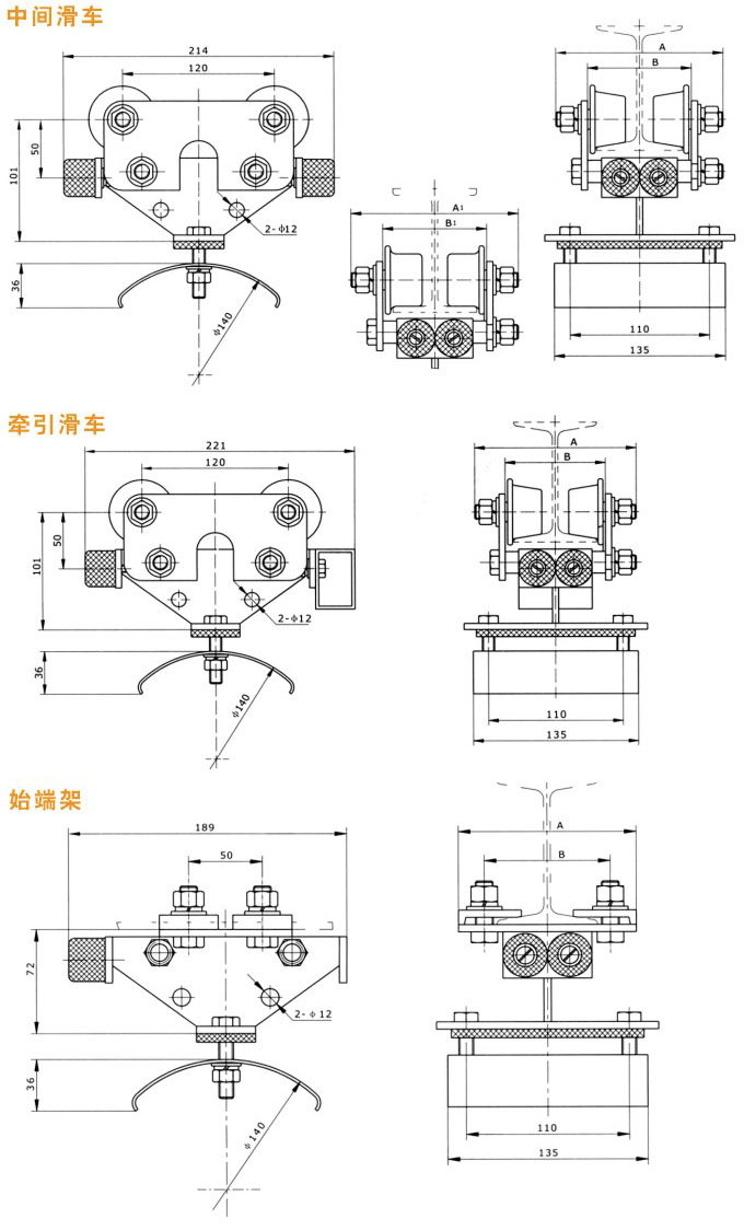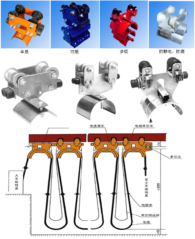 HC系列電纜滑車分為中載荷型、重載荷型、和輕載荷型,因此滑車走輪為Ф80、Ф63、Ф50的三種,承載能力≤50~150kg,每類按托板層數(shù)分為單層、雙層、三層,每類中有三種形式,首端為電纜牽引車,終端為固定掛線架,中間為電纜滑車。