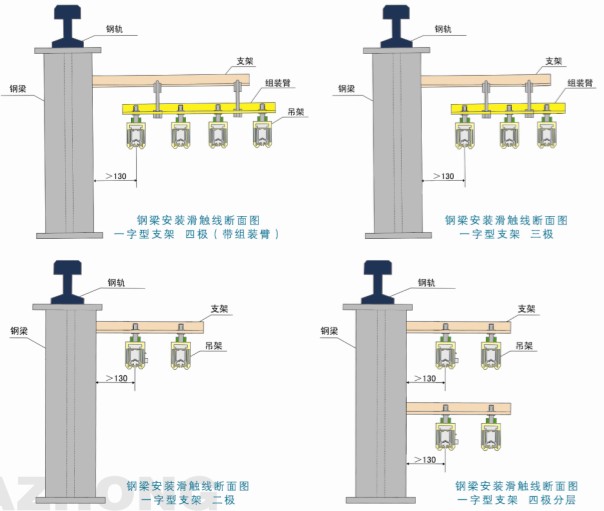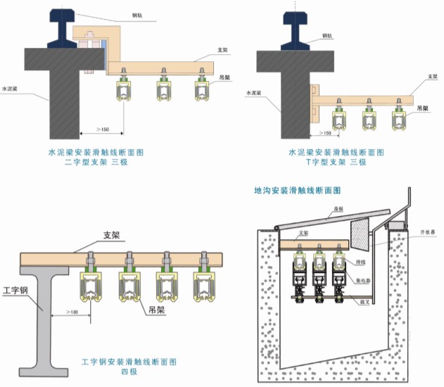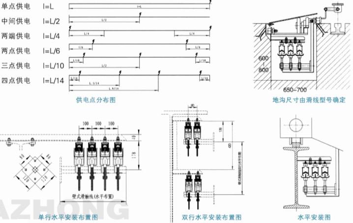 檢修段 端帽 4、藕合接頭(連接器)  接頭護(hù)套I型 對(duì)合式護(hù)套 鋁接頭 銅接頭 5、懸吊夾(吊架) 吊架 分體加厚吊架 耐高溫吊架 鋁合金吊架 6、 指示燈  7、驅(qū)動(dòng)臂  8、安裝支架、組裝臂  注:關(guān)于附件詳細(xì)資料請(qǐng)參閱“H型滑觸線附件”章節(jié) 六、安裝形式