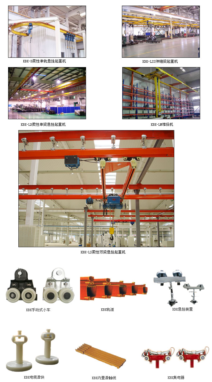 KBK柔性輕型組合系統(tǒng)起重機(jī)包括KBK-D單軌道、KBK-LD單梁、KBK-LS雙梁、KBK-LSS伸縮梁、KBK-LM堆垛機(jī)等各種型式的起重設(shè)備,起重量0.125t~2t適應(yīng)范圍極廣,尤其適用于現(xiàn)代化生產(chǎn)輸送線,其特點(diǎn)概述如下: 1、可靠性好、穩(wěn)定性高 KBK輕型起重機(jī)系統(tǒng)的組成部件全部是標(biāo)準(zhǔn)模塊,可以保證大批量、高質(zhì)量生產(chǎn),因而系統(tǒng)十分可靠;系統(tǒng)模塊的主體是三種規(guī)格的冷軋型材,強(qiáng)度大,剛度好,自重輕,保證了系統(tǒng)的穩(wěn)定性。 2、適應(yīng)能力強(qiáng) KBK系統(tǒng)可根據(jù)工廠各工位的需要,靈活地設(shè)計(jì)安裝起重機(jī)系統(tǒng),從定點(diǎn)運(yùn)送到高準(zhǔn)確度地多點(diǎn)、多節(jié)拍的自動化輸送線,都能隨意組合而成�?捎糜谛略O(shè)計(jì)的廠房,也可用于舊系統(tǒng)的改造或延伸。 3、安裝方便,經(jīng)濟(jì)**** KBK系統(tǒng)的安裝調(diào)試很方便,型材及各標(biāo)準(zhǔn)模塊之間只須用螺栓連接即可使用,可節(jié)省工廠的空間和面積,大大減少了人力資源,提高生產(chǎn)效率,從而降低能耗,提高企業(yè)效益。系統(tǒng)可以手動操作,也可以實(shí)現(xiàn)自動、半自動操作,運(yùn)行****。